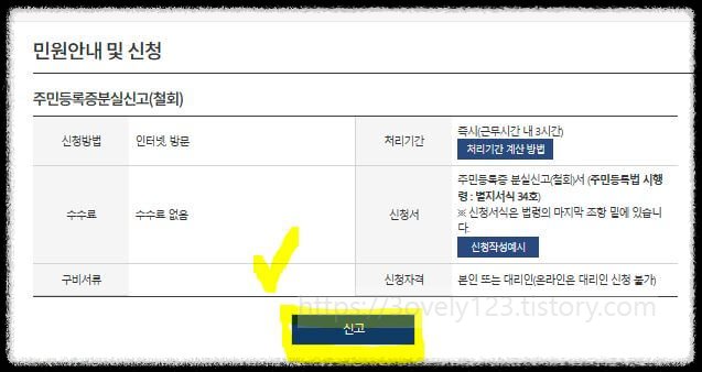 5. 주민등록증 분실신고(철회) 신청서를 작성합니다. 개인정보이용 동의 후 필수 입력사항 작성합니다. 그리고 구분에서 분실신고를 선택 후 분실일과 사유를 작성합니다. 신청을 누르면 신청이 완료됩니다.